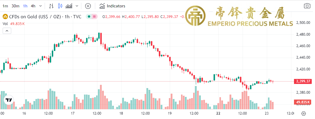 週一金价延续跌势,早段开市小幅高开,最高见2412,之后下滑,中段轻微反弹,尾段再度下挫,最低跌至2383,不过收市前有所回升。昨日市场基本面仍然较为清淡,金价虽然延续上星期尾段跌势,但整体跌幅已明显减弱