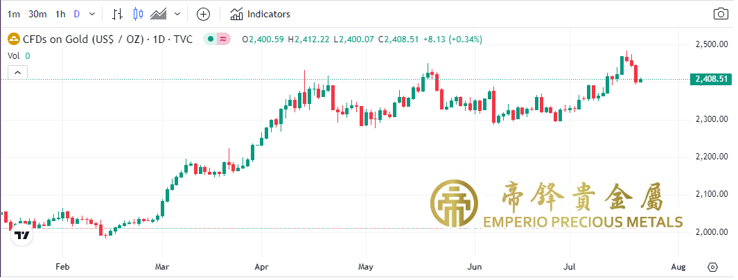 週五金价大幅下跌,早段开市即见全日最高2445,之后下滑,中段过后持续下跌,尾段一度跌穿2400整数关口,最低跌至2393,收市前险守2400。上星期金价整体走势相当反复,先连续两日创出历史新高,但其后由最高点下跌接近100美元,而下跌更缺乏明显因素导致,大致可以推断为近期累积相当大升幅从而产生获利回吐,不过如能守稳2400,后续仍有望重上高位