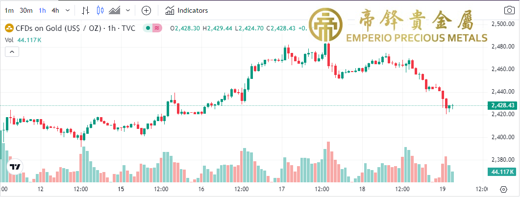 週四金价继续下挫,早段开市先反弹,中段最高升至2474,之后受阻下跌,尾段跌势加剧,收市前最低跌至2440。昨日欧洲央行公布议息结果,一如市场预测维持利率不变,不过会后行长拉加德表示,对9月减息持开放态度,欧元下挫导致金价一定程度受累,连续第二日由高位下挫