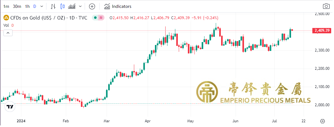 週四金价强势突破2400,早段开市即见全日最低2370,之后向上小幅攀升,中段急速上涨,尾段最高升至2424,见5月22号以来最高,收市前有所回落。昨日公布的美国六月通胀CPI按年录得增长3%,较市场预测的3.1%更低,同时核心CPI更加连续第二个月刷新近三年低位,反映通胀继续稳步下调,市场认为联储局有超过8成的机会会係九月开始减息,金价成功突破2400
