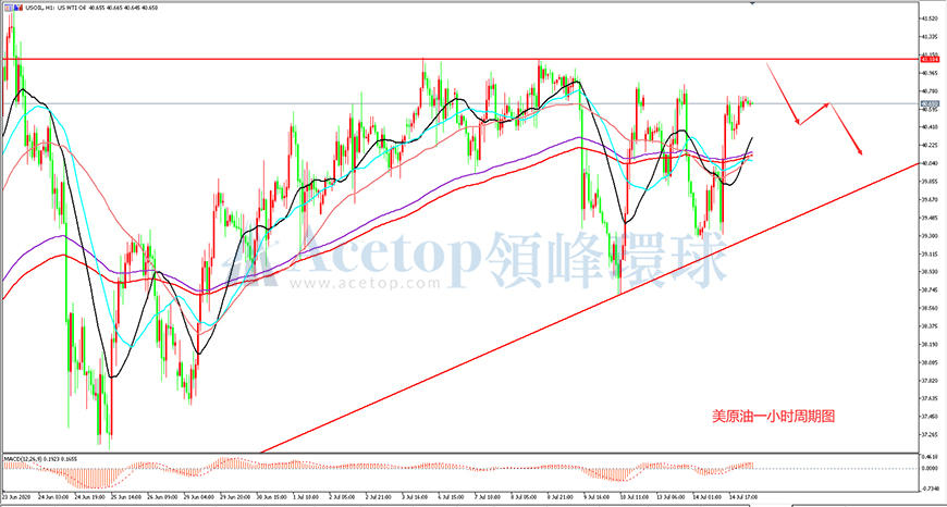 从上图美原油一小时周期图来看,美原油走势震荡,震荡区间大致位于39.20-41.00,目前来看,趋势并不明显,日内倾向于延续震荡走势。从均线上来看,EMA144均线和EMA169均线处于美原油震荡区间的中间位置,与此同时,MA21均线,MA34均线和MA60均线都被美原油的K线反复穿梭,这显示出美原油的趋势走势并没形成,上图中在41.10处为美原油画出了一条水平压力线,预计日内走势,美原油将会在此受阻回落,故今日策略建议在该位置附近布局空单。