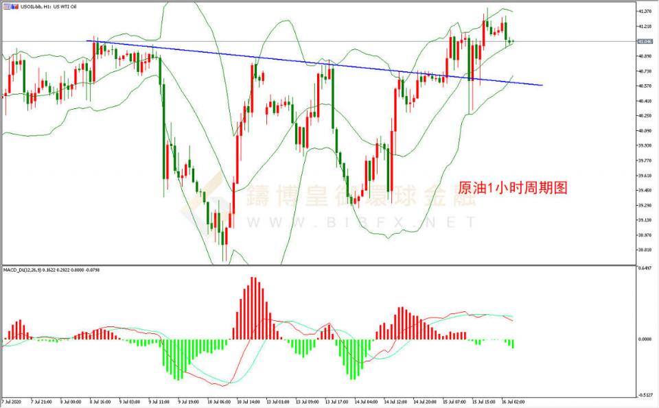 原油昨天探底回升,日线收阳,上涨动能相对较强。如下图1小时周期所示,昨天原油盘中快速下跌,探测前期下降趋势线的反支撑位,随后再度上涨,并创出近期上涨新高。指标方面,MACD始终运行在零轴上方,保持着多头趋势。同时,K线目前远离布林带中轨上方,且布林带三轨处于上行过程中,维持看多。操作上,建议日内依托中轨支撑尝试做多。