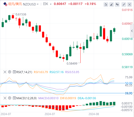 需要关注的直接阻力位是0.6085-0.6090区域,代表8月14日的高点和布林带的上边界。如果持续高于这一水平,则可能会反弹至7月8日的高点0.6154。下一个关口位于0.6222,即6月12日的高点。