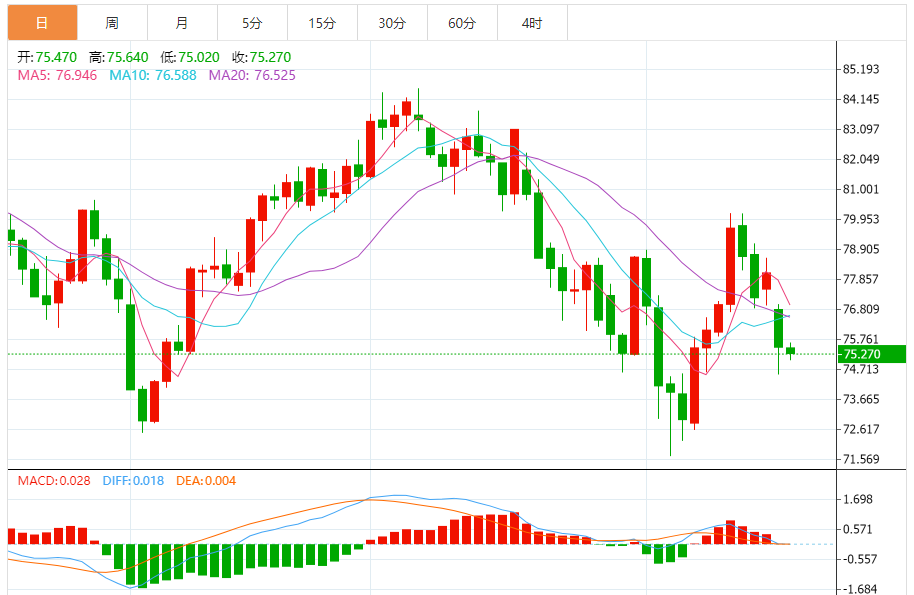 今天的预期交易区间:在74.70美元支撑位和77.70美元阻力位之间