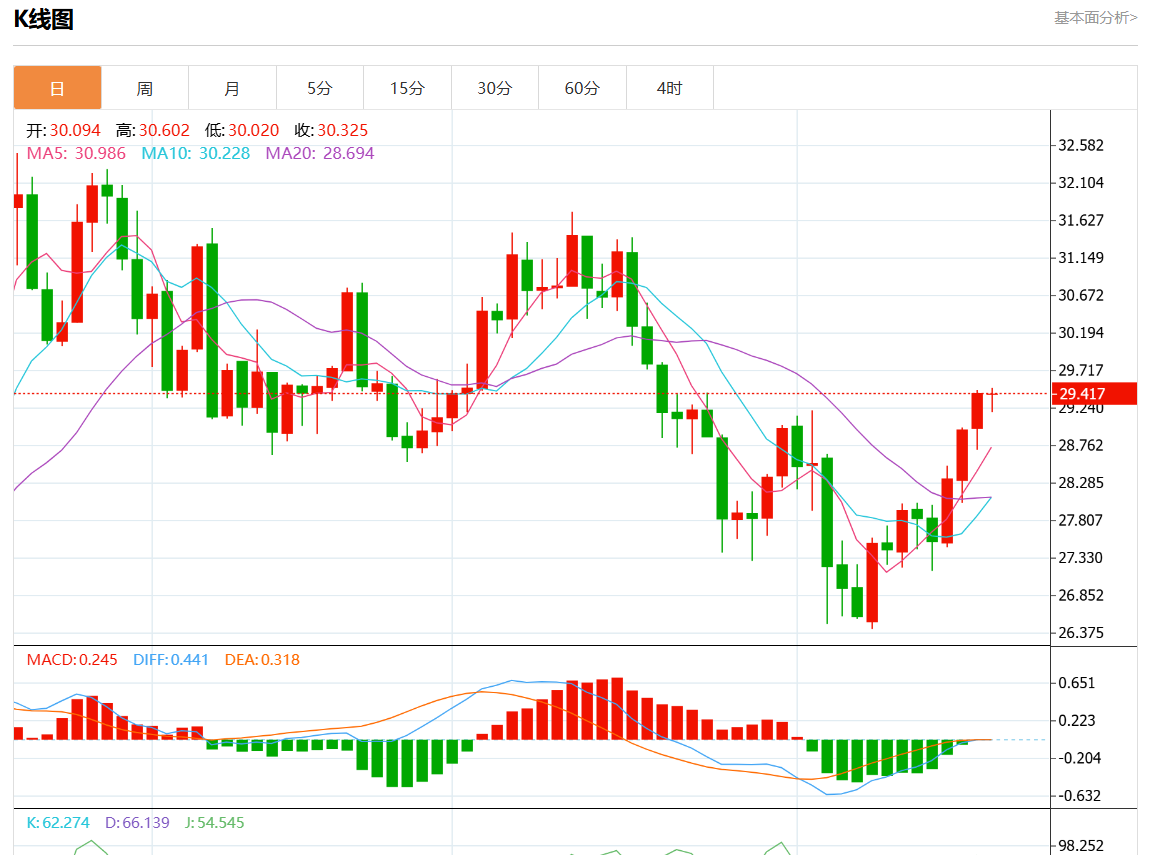 周二欧市盘中,现货白银报29.637,涨幅0.73。