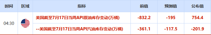 美国至7月17日当周API原油库存+754.4万桶,预期-195万桶;美国至7月17日当周API库欣原油库存+71.6万桶;美国至7月17日当周API汽油库存-201.9万桶,预期-117.5万桶;美国至7月17日当周API精炼油库存-135.7万桶,预期-55万桶。