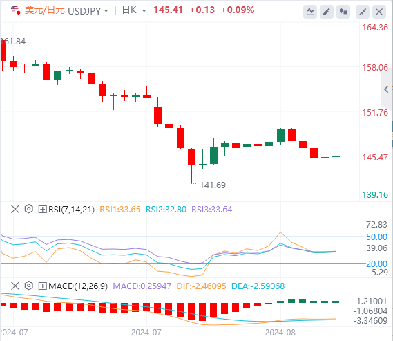 周三公布的美联储(Fed)7月30-31日会议纪要显示,大多数美联储官员上月一致认为,只要通胀继续降温,就可能在即将于9月召开的会议上下调基准利率。决策者在 7 月份将基准利率维持在 5.3%,这一水平已维持了一年多。市场完全定价 9 月美联储将降息,预计到今年年底降息幅度将达到整整一个百分点。美联储降息预期的升温可能会在短期内打压美元/日元,并限制美元/日元上行空间。另一方面,大多数经济学家预计日本央行将在年底前再次加息。路透社周三的一项民意调查显示,对年底利率的预测中值为 0.50%,增幅为 25 个基点(bps)。交易商将从日本央行行长植田和男周五在国会的发言中获得更多线索。如果植田和男发表鹰派言论,可能会提振日元兑美元汇率。