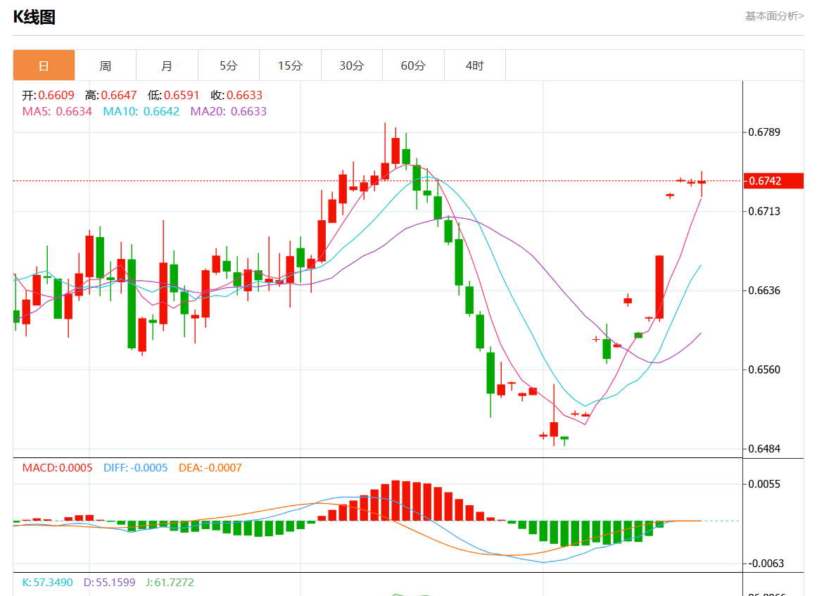 周四盘中,澳元/美元报0.6749涨幅0.10%.