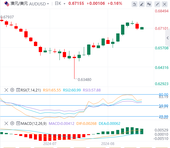 澳元周五交投于0.6710附近。日线图分析显示,澳元/美元货币对已跌破上升通道下方,表明看涨偏见减弱。然而,14 天相对强弱指数 (RSI) 仍高于 50 关口,支撑了持续的看涨势头。