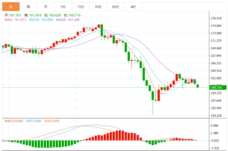 周一,欧元/日元下跌0.56%至160.705附近。