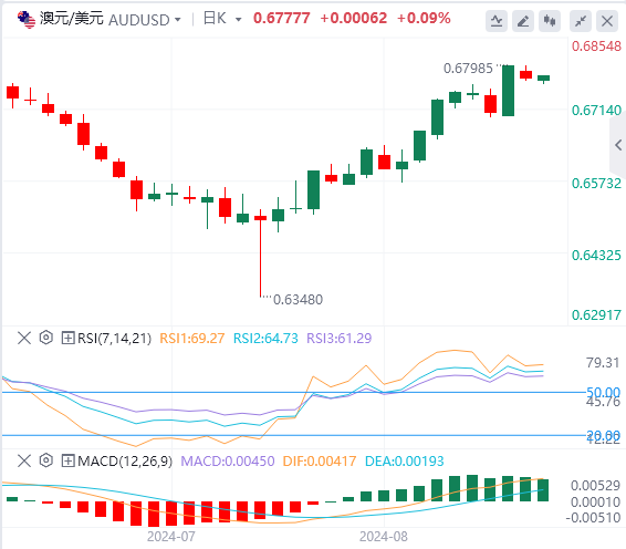 阻力位方面,澳元/美元货币对测试七个月高点0.6798水平的直接障碍,然后是上升通道的下边界0.6800水平。突破该水平可能会导致该货币对探索上升通道上边界附近的区域0.6940水平。