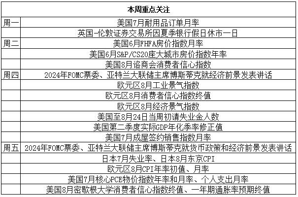本周国际现货黄金开市价为2512.93美元/盎司, 上周美联储主席鲍威尔讲话,市场普遍认为美联储9月加息已落实,以及地缘紧张局势继续支撑金价,今日关注美国7月耐用品订单数据,本周继续关注美联储官员讲话,重要经济数据关注美国8月24日当周初请失业金、美国8月谘商会消费者信心指数和美国7月PCE物价指数等。