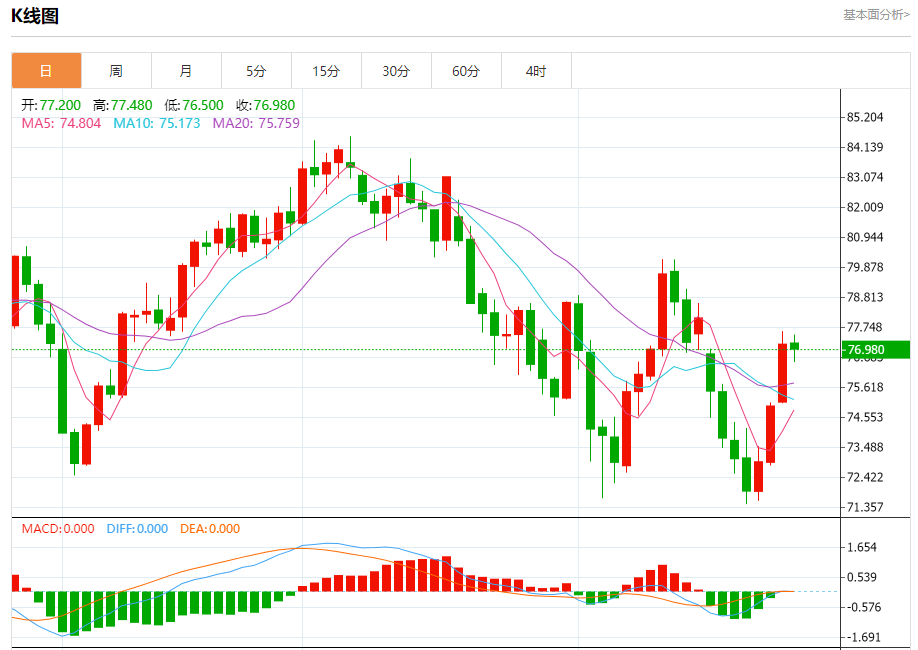 周二盘中,WTI原油报76.820,跌幅0.77%。