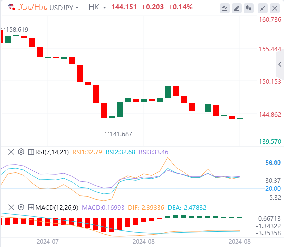 阻力位方面,美元/日元可能会挑战145.23附近9天指数移动平均线(EMA)的直接障碍。突破该水平可能会为该货币对探索回落转阻力位154.50附近的区域铺平道路。