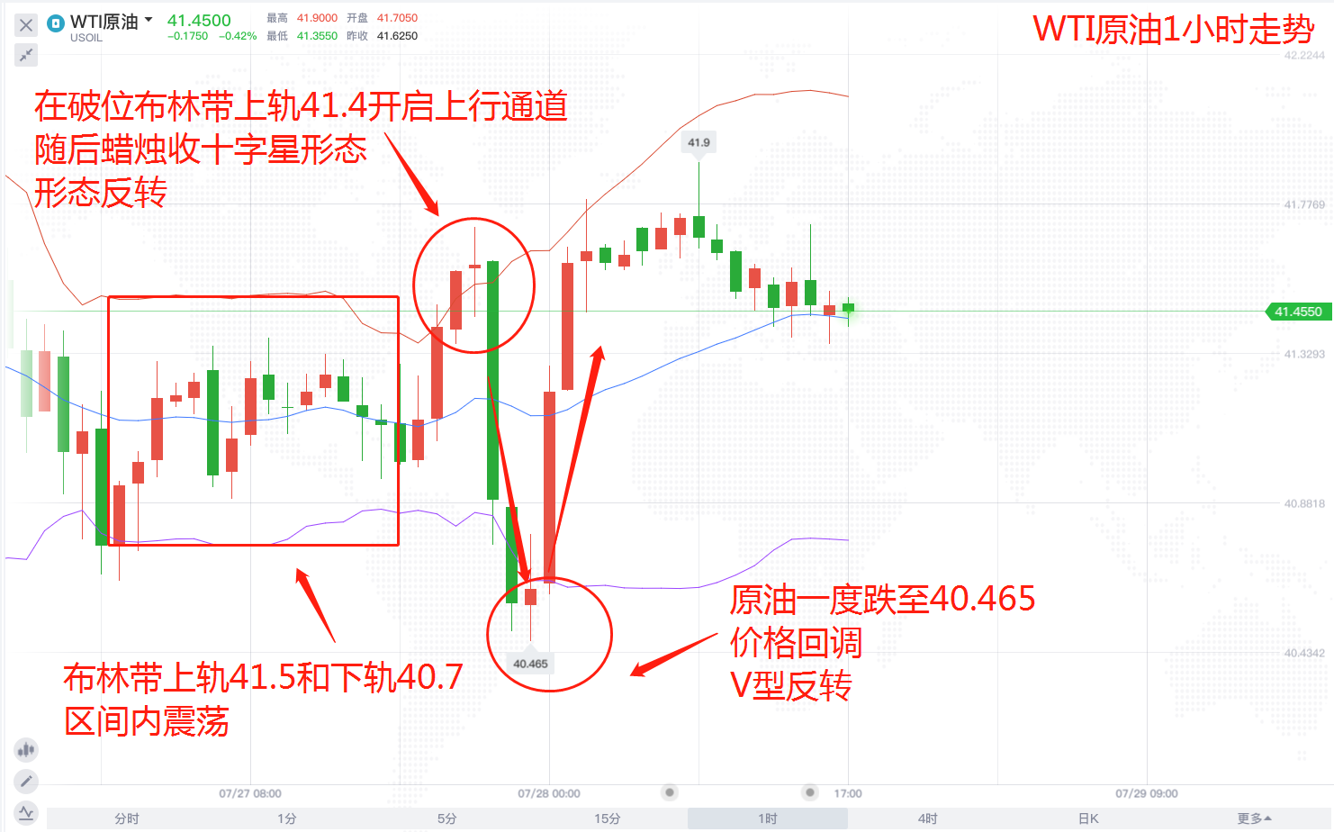我们来看下WTI原油价格走势,居于布林带下轨40.7和上轨41.5轨道内震荡运行,随即破位中轨41.4布林带开口向上,但下一根蜡烛收成十字星形态,价格发转,一个根蜡烛从41.6开始跌破布林带上轨和中轨,影线刺破下轨至40.8,原油价格一度试探40.4的支撑位,多头依托布林带下轨40.6开始反击,破位41.1开启上行通道,形成经典V型反转