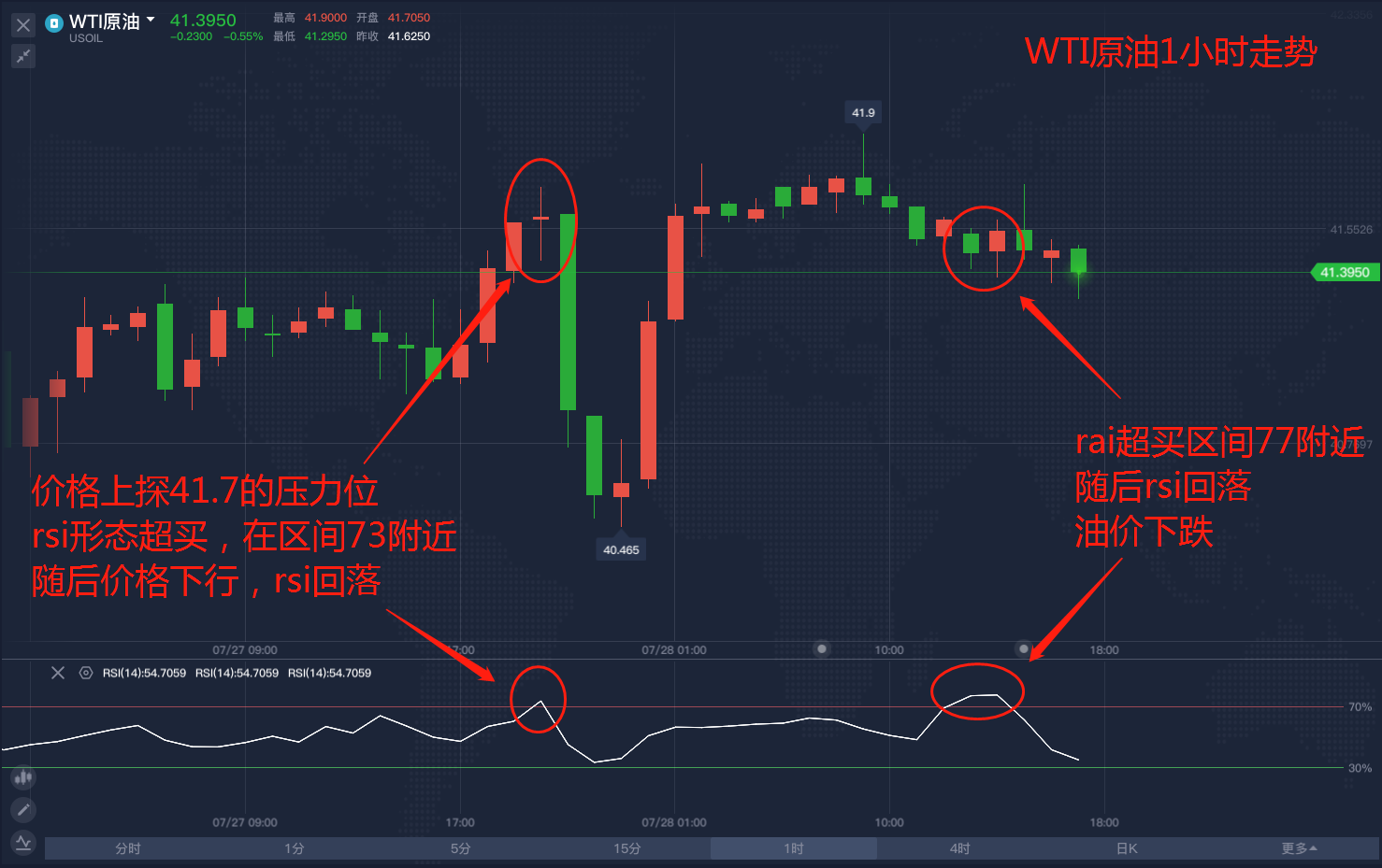 我们用RSI相对强弱指标来观察一下,市场里多空双方走势博弈,油价走出短暂的震荡后拉升,上探至41.7的压力位,rsi出现了明显的超买,指标显示涨至了73附近,证明此时的油价上涨超出了绝大部分投资者的心理预期,更多的投资这认为油价在这个点位是不合理的,随后原油下跌也验证了,rsi跌至32附近后迅速拉升至56附近,原油形态经历一个经V型反转