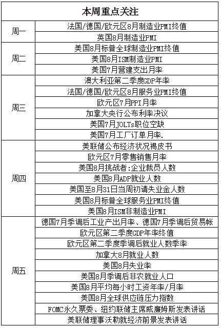 本周国际现货黄金开市价为2503.44美元/盎司, 上周PCE数据影响持续,美联储降息50个基点预期降温,美元指数走强,现货黄金价格跌破2500关口,现在报价在2496位置附近,市场静待更多信息来判断美联储是否会采取小幅降息25个基点,还是将采取更激进措施降息50个基点,本周五将迎来美国8月非农数据,在非农数据公布前,需关注美联储经济褐皮书、ADP就业数据、初请失业金等重要经济数据。
