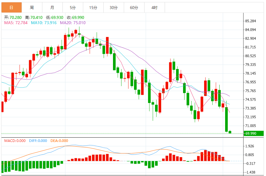 布伦特原油期货收跌3.77美元,或4.9%,收报每桶73.75美元,为12月12日以来最低水平。美国原油期货下跌3.21美元,跌幅4.4%,收报70.34美元,也是12月以来的最低水平,周一是美国劳动节假期,美国原油没有结算。