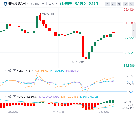 由于周五的美国劳动力数据降低了美联储(Fed)在9月会议上大幅降息的可能性,因此美元/印度卢比的下行空间可能会受到限制,因为美元获得支撑。美国8月份非农就业人数(NFP)增加了142,000个工作岗位,低于预期的160,000个,但比7月份下调的89,000个有所改善。