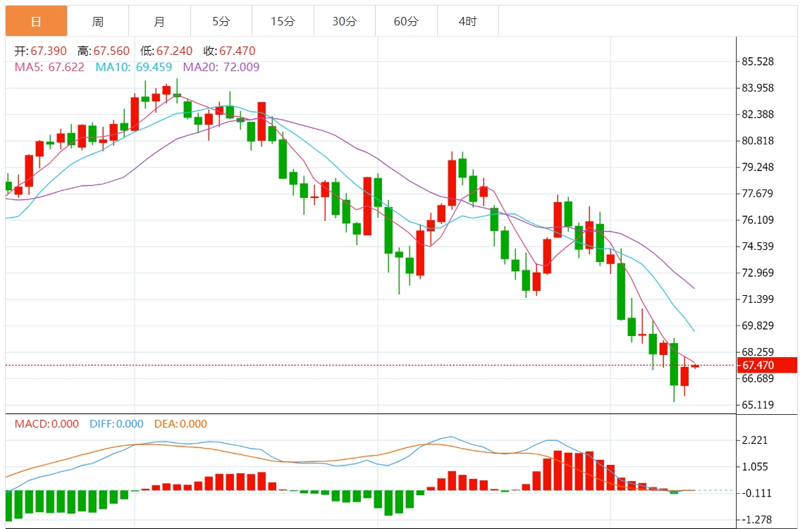 由于全球石油需求前景修正带来的看跌影响,油价重新测试了65美元区域的强劲支撑,并可能进一步下跌至通道下端和60美元区域。