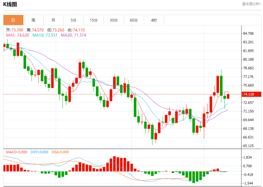 周四盘中,WTI原油报74.090,涨幅1.17%。