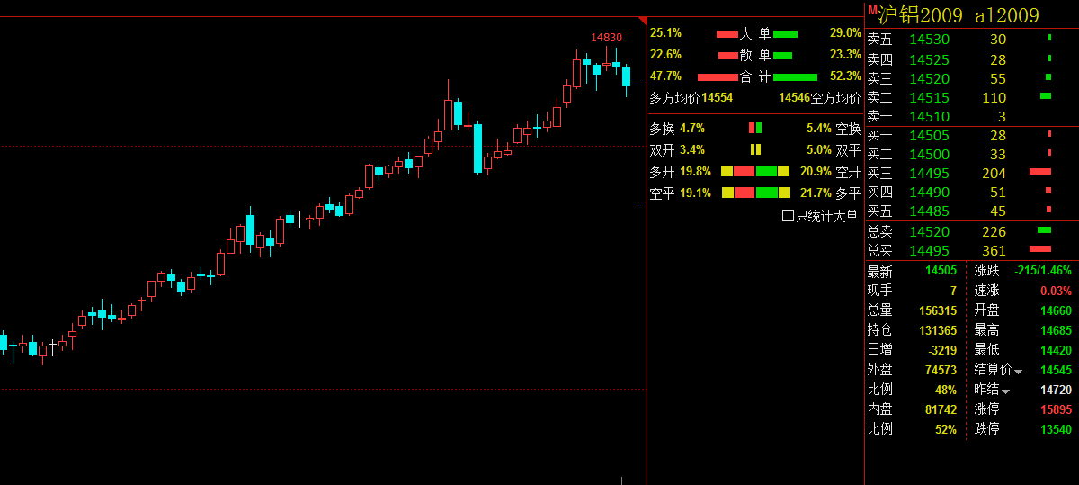 SMM8月6日讯:今日日间收盘沪铝al2009合约下跌1.46%,报14505元/吨,日持仓量减少...