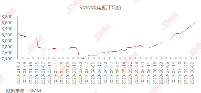 SMM8月6日讯:自今年3月底以来,废电瓶价格整体呈上涨趋势,截至8月6日,据SMM调研,废电瓶价格均价为8650元/吨,涨幅高达16.5%。近期合肥、山东、四川等地开展打击废铅酸蓄电池环境违法行为专项行动,是否助推废电瓶价格继续上涨?