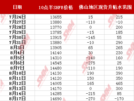 【佛山不锈钢日评】SMM 8月17日讯:周一受不锈钢期货价上行趋势,华南地区300系冷热轧部分现货均价较上周五有明显补涨回调趋势,另外也有个别规格维持稳价出货,但受各系整体市场成交氛围偏清淡影响,暂无力支撑现货资源走强,因此短期300系现货价格拉涨幅度有限。佛山地区各系钢材报价方面,国营304/2B切边卷价较上周五市场均价持稳报在14650-14950元/吨,民营304/2B毛边卷较上周五均价回调250元/吨在14250-14350元/吨,304/ NO. 1五尺报价较上周五均价小幅回调50元/吨报在13350-13650元/吨,对10点30分SHFE SS2010合约卖价14690元/吨,佛山不锈钢现货贴水170-270元/吨。(现货切边=毛边+170)。