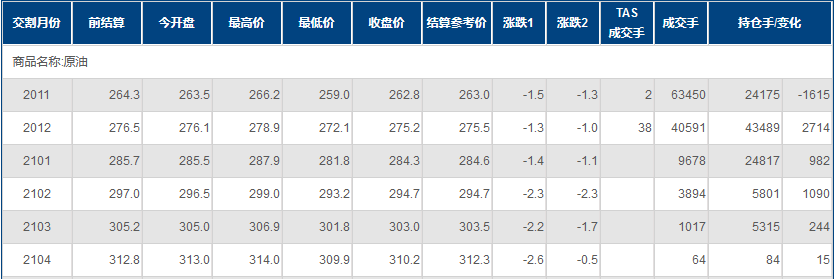 上海原油价格下跌。主力合约2011,以262.8元/桶收盘,下跌1.5元/桶,跌幅0.57%。全部合约成交118838手,持仓量增加3456手至105023手。主力合约成交63450手,持仓量减少1615手至24175手。