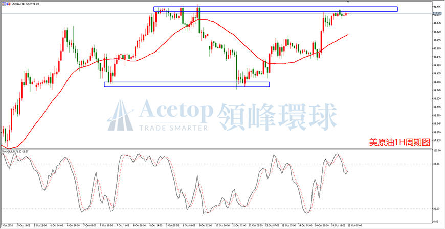 美原油一小时周期来看,油价处于高位整理区间。油价已经到了相对高位,目前油价正在测试左侧前期高点41.50美元附近的压力,下方Stoch技术指标已经到了相对高位。如果本次上攻未能有效突破有效41.50美元附近的压力,则后期回调的可能性会越来越大。预计高位压力还是较强,此位置仅需防止油价突破,可以用小成本去博取大利润。因此,资者可以尝试在高位压力附近布局空单。