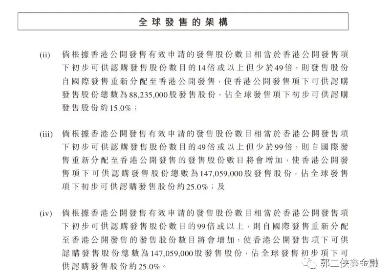 此次共计发行约5.88亿股股票,国际配售10%,公开发售10%,若公开发售超购14倍-48倍,公开发售比例将由10%增至15%,超购49倍-99倍即增至25%,超购99倍或以上则回拨至25%。