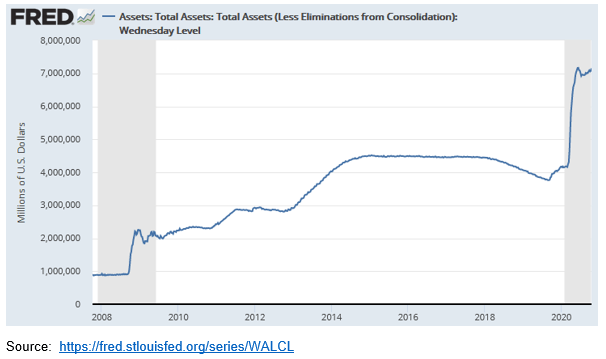 另一方面,目前美联储的资产负债表规模是2008年金融危机前的7倍,仅去年一年,就从3.75万亿美元增至7万亿美元。这可能进一步推动金价上涨。