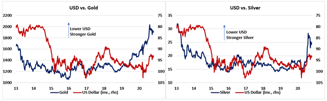 黄金和白银价格往往会在实际利率下降的时期飙升。此前实际利率一度从2018年底的超过1%暴跌到2020年8月的-1.4%,但在过去两个月里,实际利率在逐渐回升,这使得金银在短期内都承压。