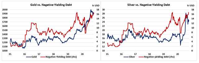 负收益率债券规模2019年8月底达到近17万亿美元的高点后有所缩减,近几个月又在上升,这可能在短期内支撑金银价格。