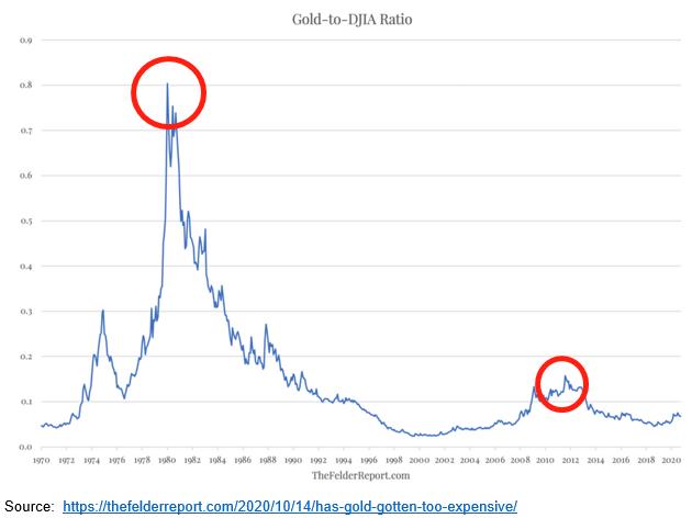 如下图所示,1980年和2011年金价都分别达到了666美元和1920美元两个高点。