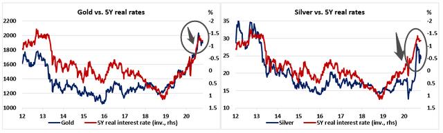 长期以来,推动黄金和白银走势的最重要因素之一是美国的实际利率走低(尤其是5年期实际收益率)。