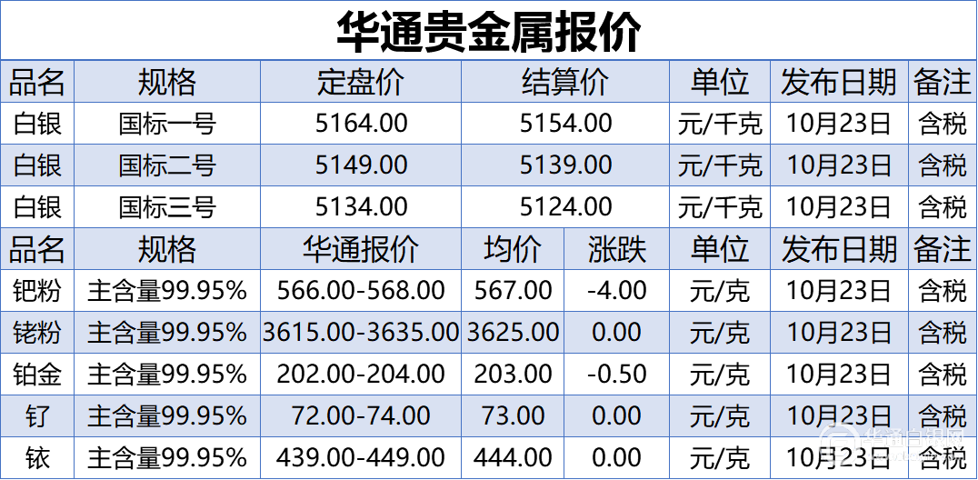 上海华通现货白银定盘价、贵金属报价(2020-10-23)