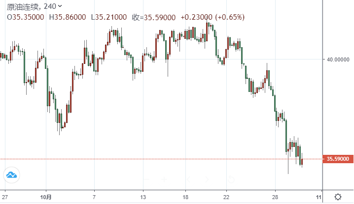市场越来越担心欧洲和美洲新冠肺炎确诊病例的激增可能会影响燃料消费,然而科威特表示欧佩克+对于延长目前的减产协议至明年没有分歧,减轻了油价的抛压。油价周五(10月29日)延续跌势,截至发稿,美国WTI原油12月期货收跌38美分,跌幅1.05%,报35.79美元/桶,其一度触及35.21美元/桶的盘中低点;布伦特原油12月期货收跌19美分,跌幅0.50%,报37.46美元/桶。此前交易日,美油收跌1.22美元,跌幅3.26%,报36.17美元/桶;布油收跌1.47美元,跌幅3.76%,报37.65美元/桶。