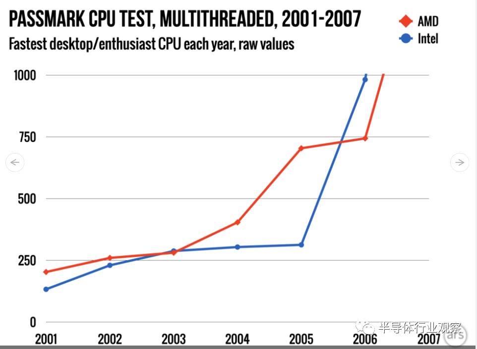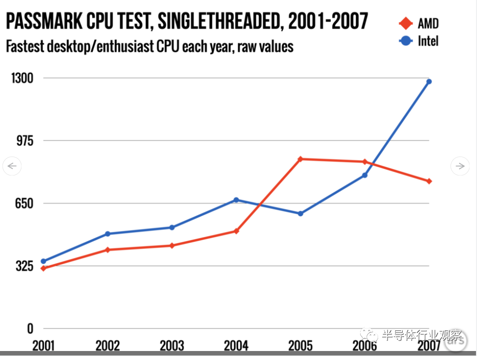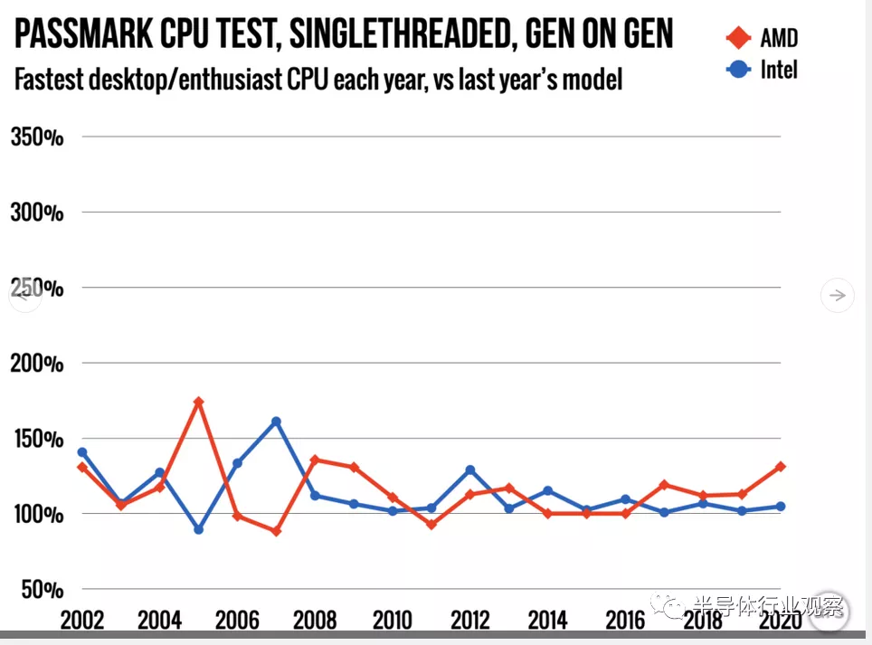 这些图表放大了两家公司各自的架构变更和工程工作的影响,从而更容易发现重大变更。到目前为止,多线程性能是最大和最令人兴奋的峰值-随着2007年四核CPU的推出,多线程性能也达到了最高性能。在单线程图表上,几乎看不到任何东西。