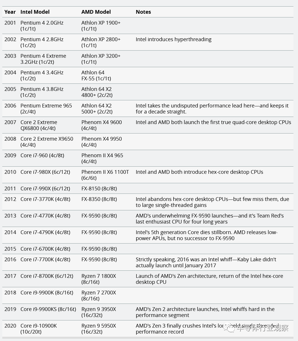 即使在AMD的这个黄金时代,英特尔在单线程性能方面也击败了AMD。Pentium 4架构作为Pentium III的较弱后继者而受到全面和应有的嘲讽,而PentiumIII往往会逐时胜过它。但是,Pentium III的时钟频率不能达到Pentium 4的水平,而且,无论如何,该时代性能最高的工作负载都是单线程的,并且英特尔的Pentium 4在性能上领先于AMD的Athlon。尽管后者的CPU性能很弱。