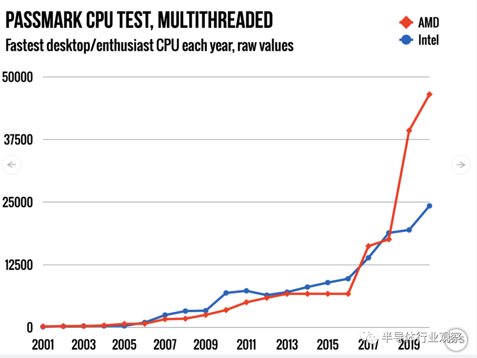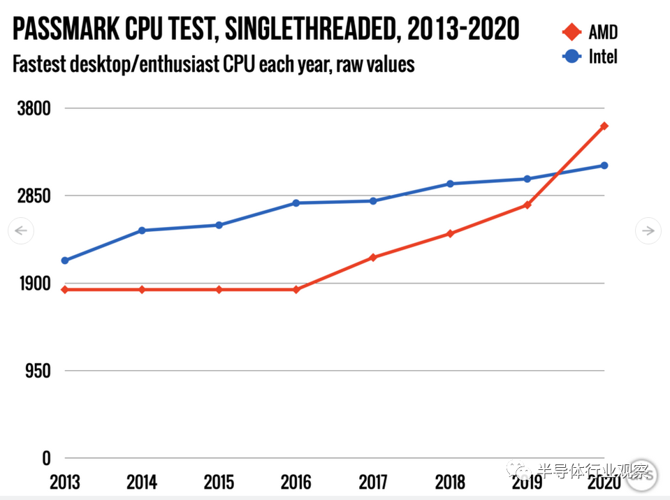 乍一看,此图表与纯多线程之间没有太大区别,但请注意,AMD的趋势线在2016年至2020年之间将保持一致。
