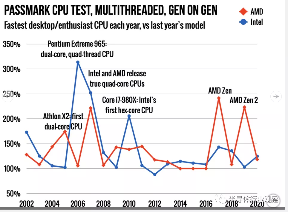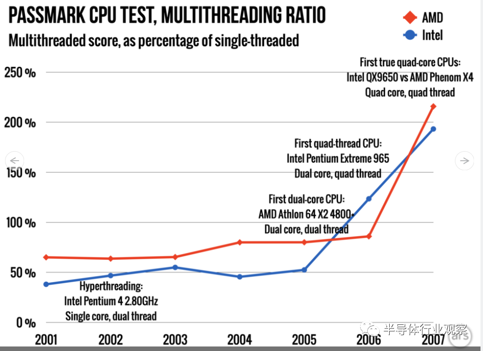 在英特尔2006年的Pentium Extreme 965(双核/四线程CPU)之前,多线程的比率没有突破100%——这意味着多线程任务比同等的单线程任务完成得更快。第二年,AMD和英特尔都推出了真正的四核桌面CPU,并永久地结束了高性能单线程处理器的时代。