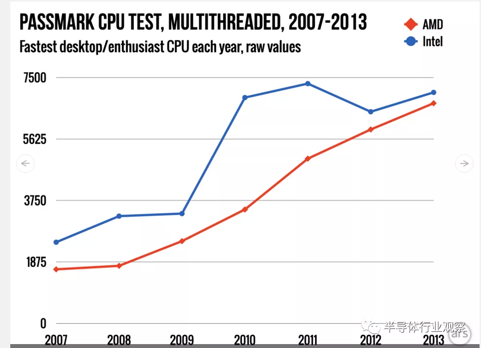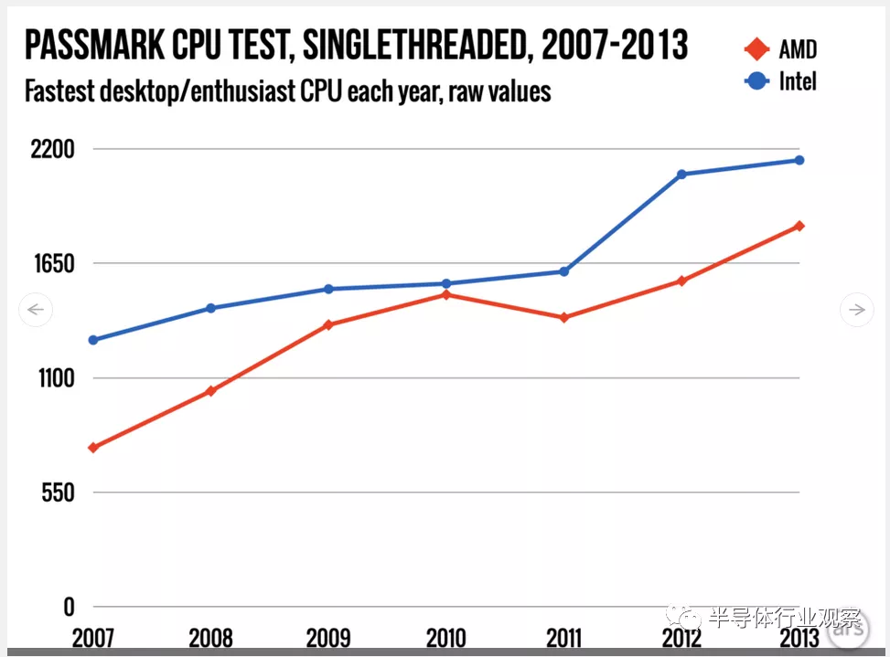 在整个2007年至2013年期间,英特尔都比AMD拥有单线程优势,而且通常是相当多的优势。