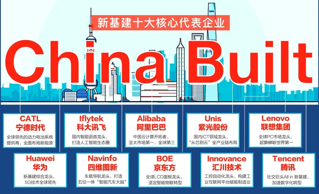 新基建基本包括七大领域:5G、人工智能、大数据、工业互联网、充电桩、特高压以及城际高铁和轨道高铁,这七大领域中每一个部分涉及到的产业都非常的庞杂。在上面的图表中,我总结出了新基建十大核心代表企业,这十家企业正好凑成一个词“China Built”。我想试图说明的是,新基建领域正在引领中国的数字经济发展,中国制造也正在从Made向Built转化。新基建既是基础设施的升级,也是技术路线的升级。