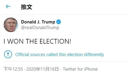 接近美东时间16日凌晨0时,特朗普发推特称“我赢了大选”,随后,这条推文被推特官方贴上“防误导”标识。图源网络