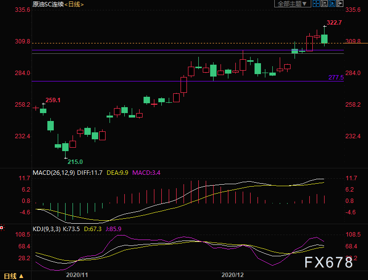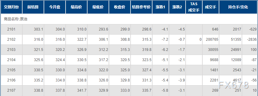 上海原油价格收跌,主力合约2102盘中创3月上旬以来高位至322.7元/桶,终盘收于308.8元/桶,跌7.2元/桶,跌幅2.28%。