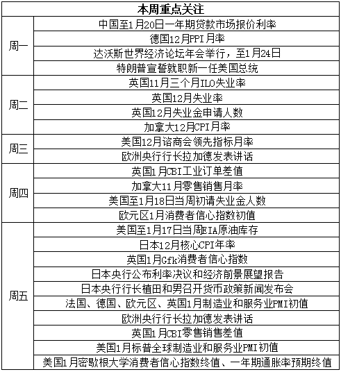 本周,国际现货黄金市场开市价为 2696.45 美元 / 盎司。截至目前,其现时报价在 2688.87 美元 / 盎司附近徘徊。值得关注的是,就在今日,特朗普即将宣誓就职新一任美国总统。特朗普过往行事风格独特,其上台之后政策走向充满不确定性。这种不确定性犹如一层厚重的阴霾,笼罩在市场之上,使得市场担忧情绪短期内难以消散。而黄金,因其具有避险保值的特性,进而增加了市场对黄金的需求。从本周经济数据层面来看,重要经济数据数量相对有限。关注美国当周初请失业金数据、日本央行利率决议和前景展望报告、美国 1 月标普全球制造业和服务业 PMI 数据、美国 1 月密歇根大学消费者信心指数以及一年期通胀预期数据。