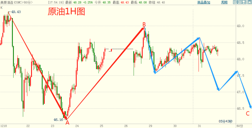日线来看原油从今年低点以来启动上涨,整体来看可能启动新的推动浪,目前在50整数关口受阻,结构上有望走调整浪。1小时图看油价从49.43高点启动下跌,目前仍然处于调整阶段,从整体结构来看C浪很可能走出5波下跌,目前很可能走C2小反弹结构,操作上建议原油短线逢高做空,具体进场以盘中形态信号为准。上方压力位于48.85和49.40,下方支撑位于47.60和47.00。(博易大师报价)(图灵波浪理论)