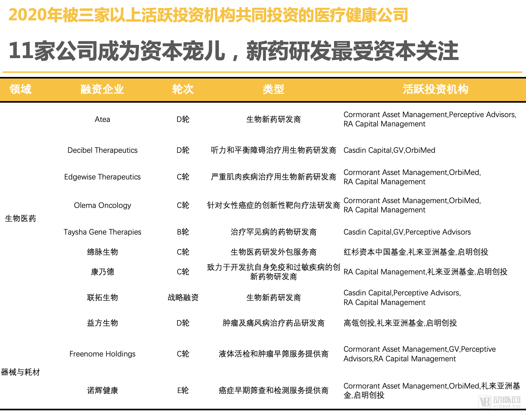 可以发现,同时被多家活跃机构押注的融资,轮次往往在C轮及以后,领域集中在生物医药,聚焦新药研发;值得关注的是,器械与耗材领域仅有的两家公司Freenome和诺辉健康均来自肿瘤早筛赛道。