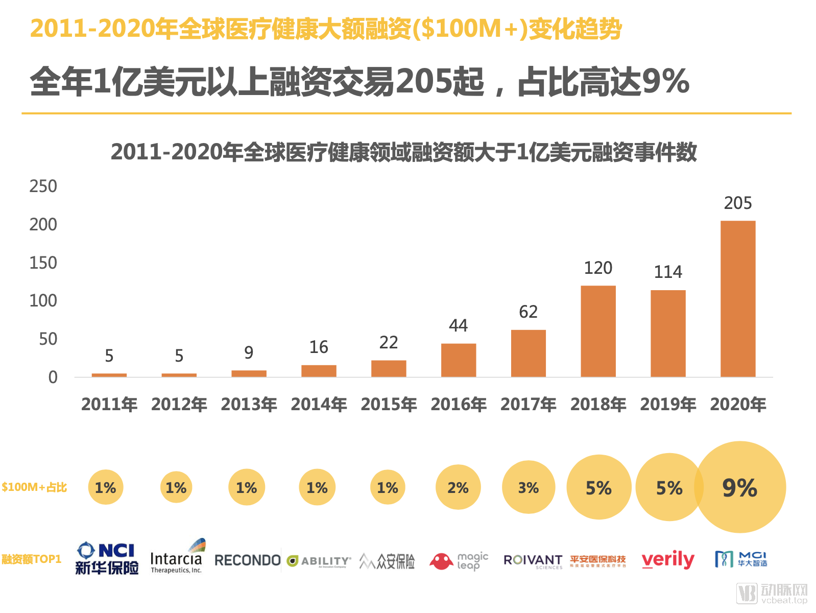 一.2020年全球医疗健康融资总额创历史新高,同比增长41%;全年1亿美元以上融资交易205起,占比高达9%